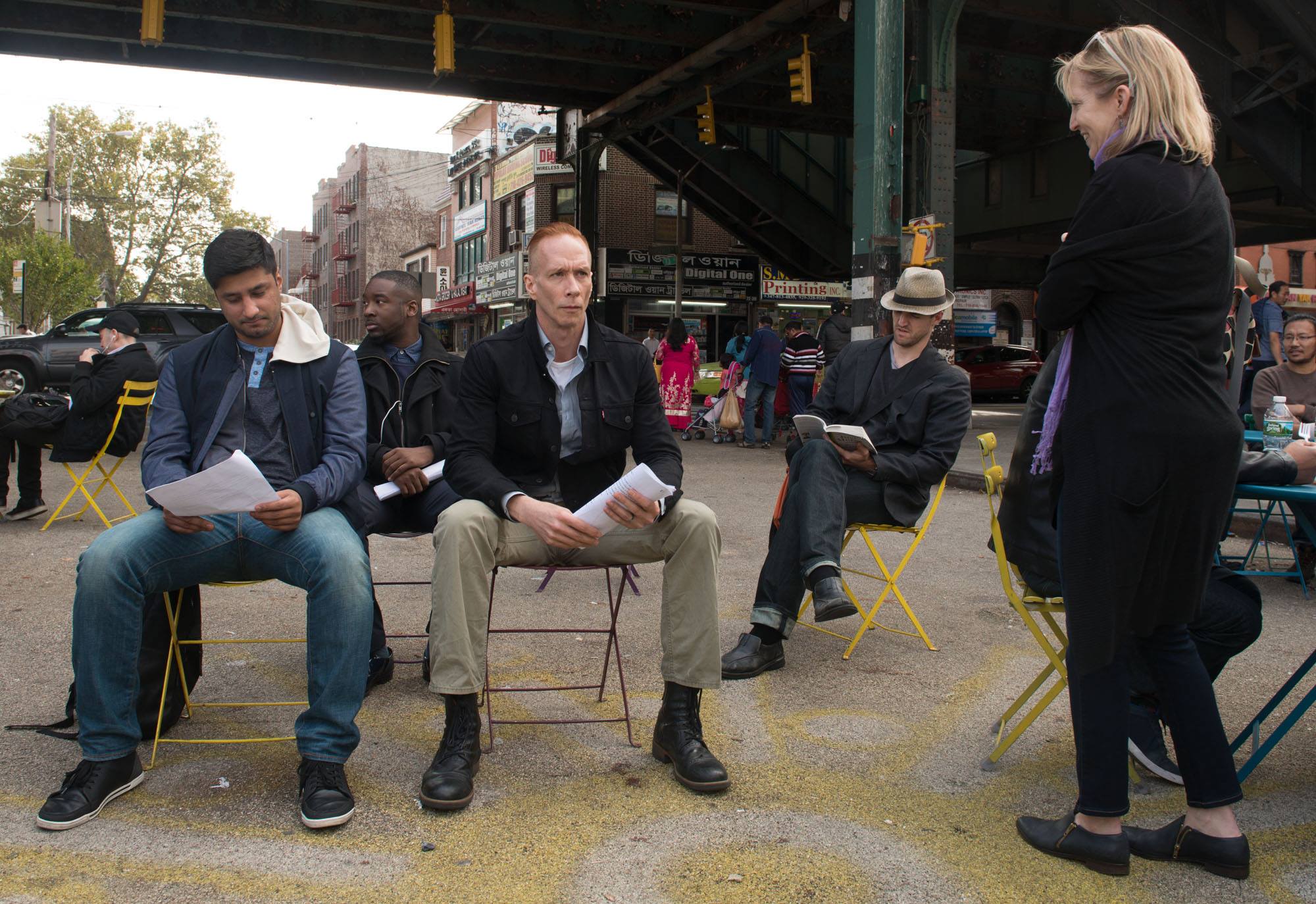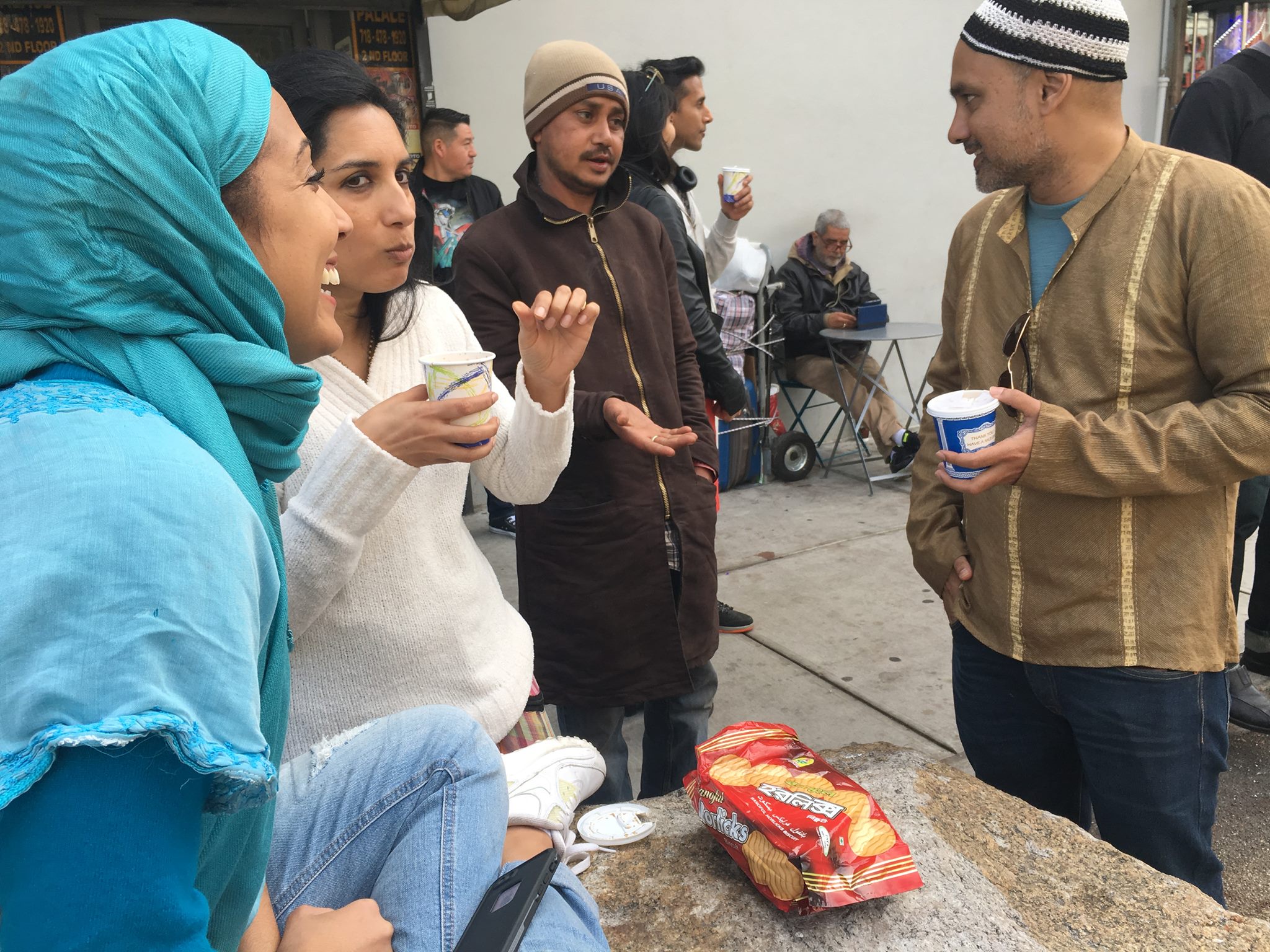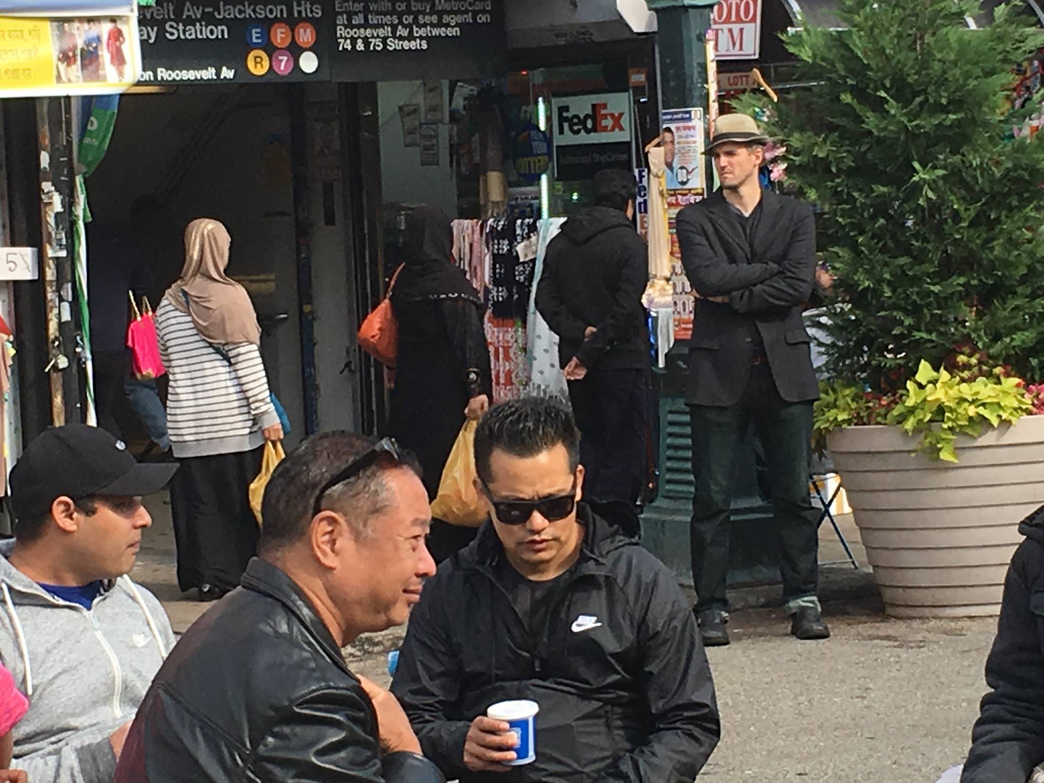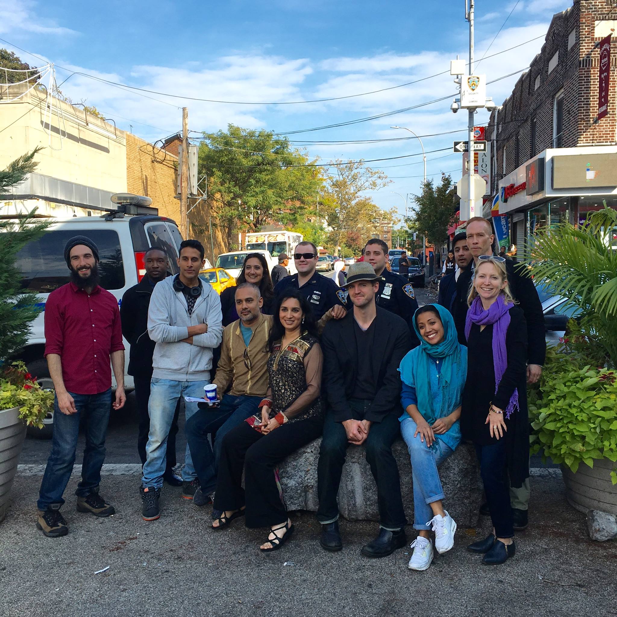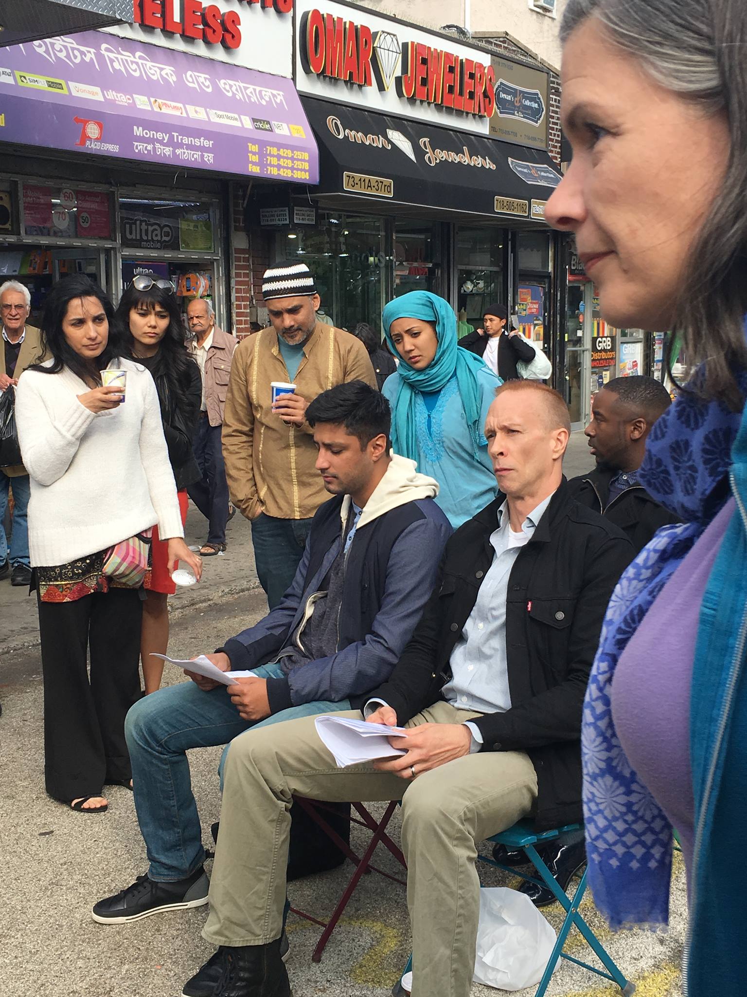 We began on a bright Saturday morning, in the triangle of Diversity Plaza, just out of earshot from the 7 Train. Performing to a crowd of shoppers, shop keepers, uncles and of course the ever present NYPD, the company of Theatre167 held their audience’s rapt attention. Particularly fascinating is how the neighborhood which inspired the book becomes a part of the drama. We followed Naeem, a local boy who becomes a watcher in his own community, drawing from the neighborhood and streets that inspired the novel.