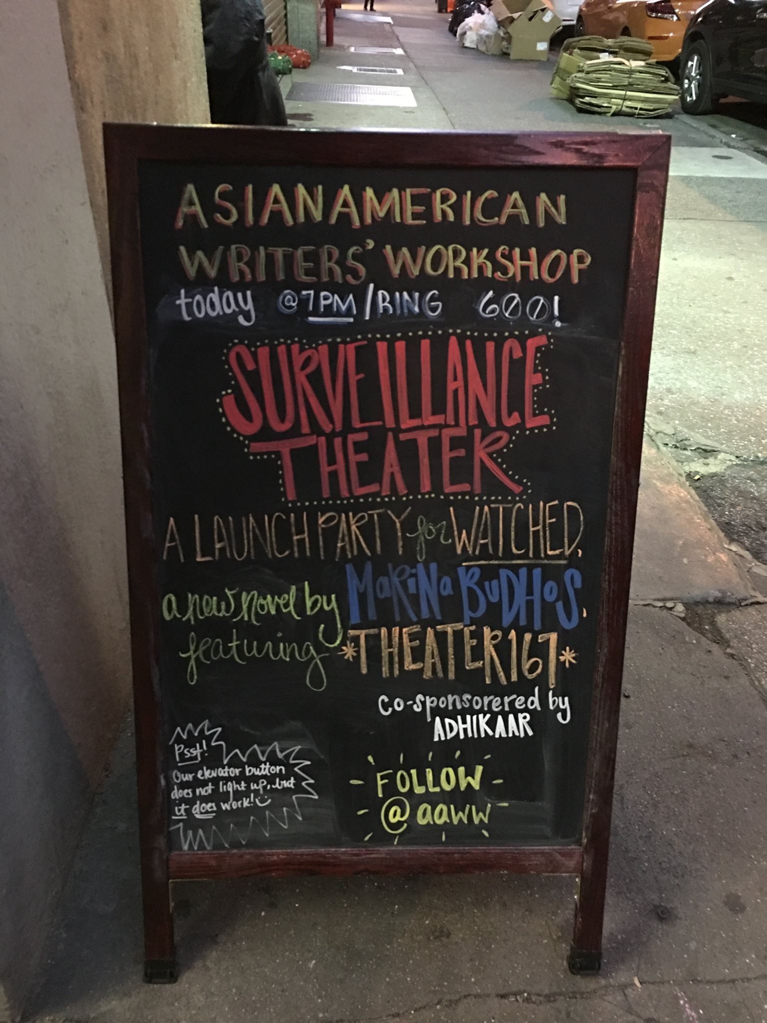 We did the first staged reading of Surveillance Theater during Marina’s New York City launch at the Asian American Writers Workshop.